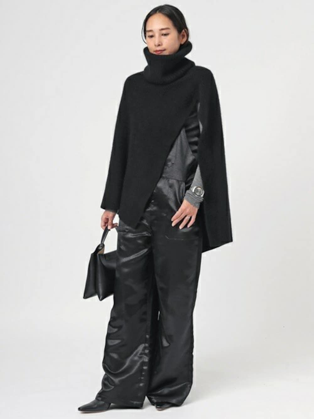取り入れるだけで鮮度のある着こなしが完成するwalenode ベッチュウ Drape Sweater With Snood。 レイヤードするアイテムによっても印象を変えて楽しめる1枚。 Wool T/N Knitをレイヤードして、モダンな着こなしに。 PROVOKE satin overallは、冬の重厚感ある素材合わせにも抜け感をプラスしてくれる、万能なアイテム。 黒小物でミニマルにまとめてブラックを主役にスタイリング。
