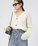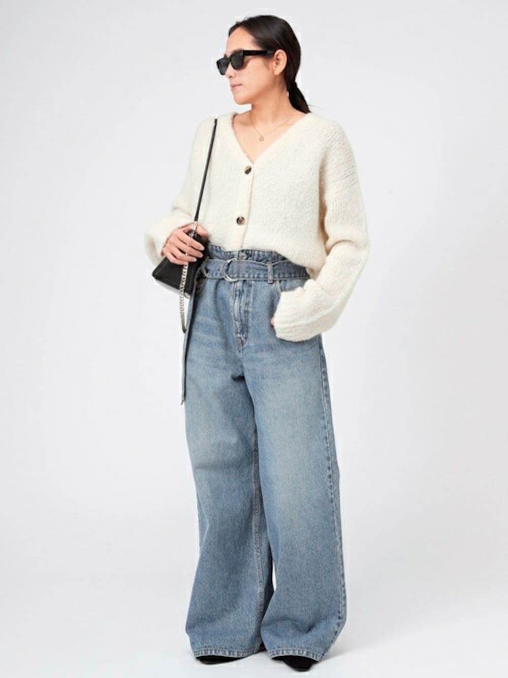 柔らかくあたたかなベビーアルパカの糸で編み立てたカーディガン。 肌触りも良く着心地の良さもポイント。 愛らしくリラックス感のあるカーデをベルテッドジーンズにインしてメリハリのあるバランスに。 ハイウエスト仕様のベルトデザインがスタイルアップを演出。 黒小物で引き締めることでモダンなカジュアルスタイルに。