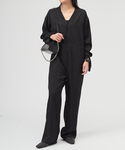 上品なツヤと落ち感のあるツイル素材が品のあるVIS ツイルオールインワン。 カジュアルにも、オケージョンにもおすすめの綺麗目に着こなせるオールインワン。 落ち感のある綺麗なシルエットが、さらっと着るだけで様になりウエストシェイプでシルエットを変えても楽しめる1着。 ブラック小物でミニマルに仕上げて、大人の気張らないワントーンスタイルが完成。 小物次第で雰囲気を変えて楽しめるオールインワンです。