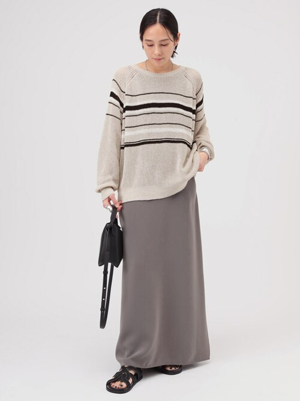 1枚で着映えるマルチボーダーが目を惹く、カームボーダーニット。 ほんのりシアーな質感と、さらっとした風通しの良いドライタッチな肌触りが春夏シーズンに最適な1枚。 スモーキーなカラーがかわいいTank OPにレイヤードしたスタイルで、ニュアンスのあるリラックススタイルに。 リラックス感もありながらシックなカラー合わせのボーダーがカジュアル過ぎず大人な印象に仕上がります。 マルチボーダーのブラックと黒小物で、スタイリングをモダンに引き締めて。