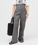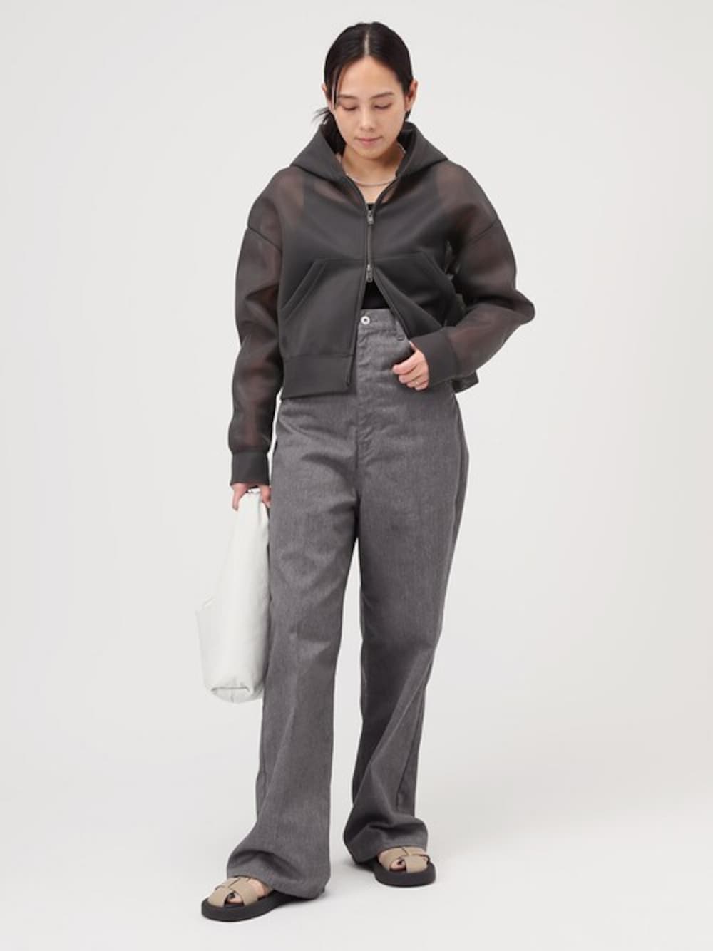 大胆なハイライズで今季らしい着こなしが完成する、エンパイアラインパンツ。 ホールド力のあるやや固めの素材を使用しているので、ボディラインを拾いにくく綺麗な脚長シルエットが楽しめる1本。 トップスには、シアーな素材感とショート丈とのバランスでトレンドライクな着こなしが叶う、シアーフーディーを。 構築的なシルエットとショート丈のバランスは、ハイライズボトムスに合わせることでメリハリのある脚長シルエットを楽しめる◎ トレンド要素もありながら、トーンの異なるグレーカラーを合わせたワントーンスタイルで大人のモダンなスタイリングに。