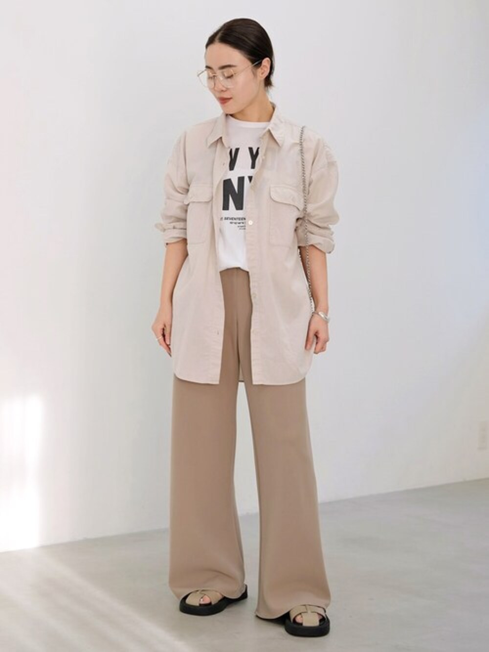 少しシアー感のあるGarment dye Shirt。 プリントTシャツとレイヤードするとほんのり透けて軽やかなレイヤ―ドスタイルが楽しめます。 ベージュの柔らかなワントーンにロゴプリントが映えてアクセントに◎ 足元はグルカサンダルでボリュームがありながらも抜け感のあるバランスがおすすめ。 華奢なシルバーアクセサリーやバッグがカジュアルスタイルに艶感と上品さをプラスしてくれます。