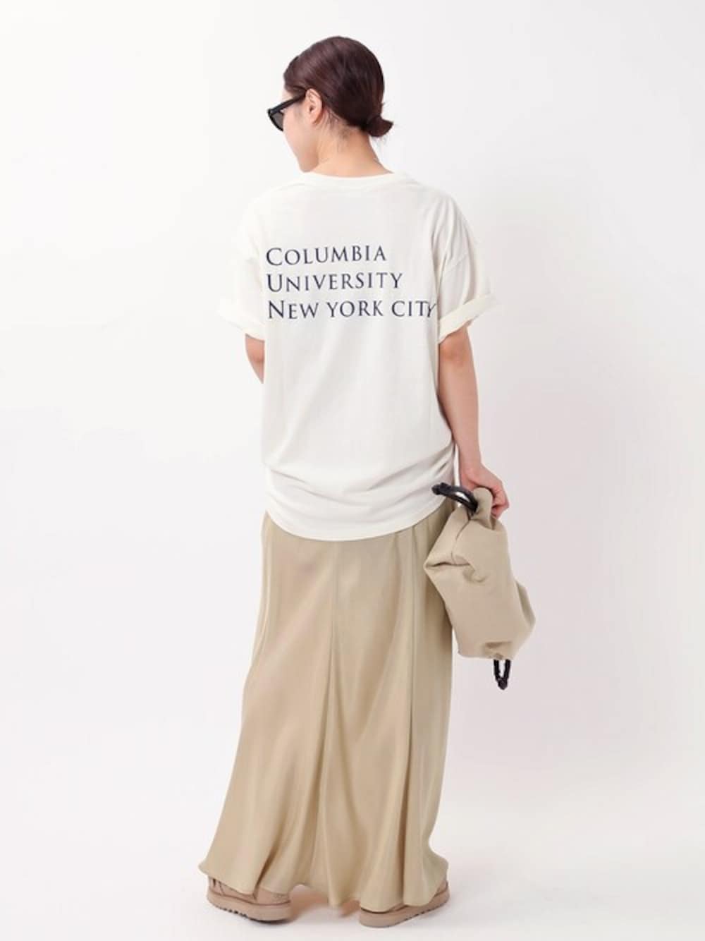 微光沢な生地感が女性らしさを演出!カジュアルなバランス感が絶妙のフィブリルキュプラスカート。 カジュアルなトップスを合わせても動くとエレガントに揺れ女性らしい印象になります。 ゴム仕様のウエストもストレスフリーな履き心地が嬉しいポイント。 さり気ないロゴが絶妙な大人が着やすい「RUSSELL ATHLETIC」のTシャツに合わせ少しエフオートレスに。 テロンとした落ち感のあるスカートにナチュラルなベージュにより女性らしさをグッと引き出してくれます。 素材やディテールがアクセントになるGOODSを合わせたバランス感もポイント。