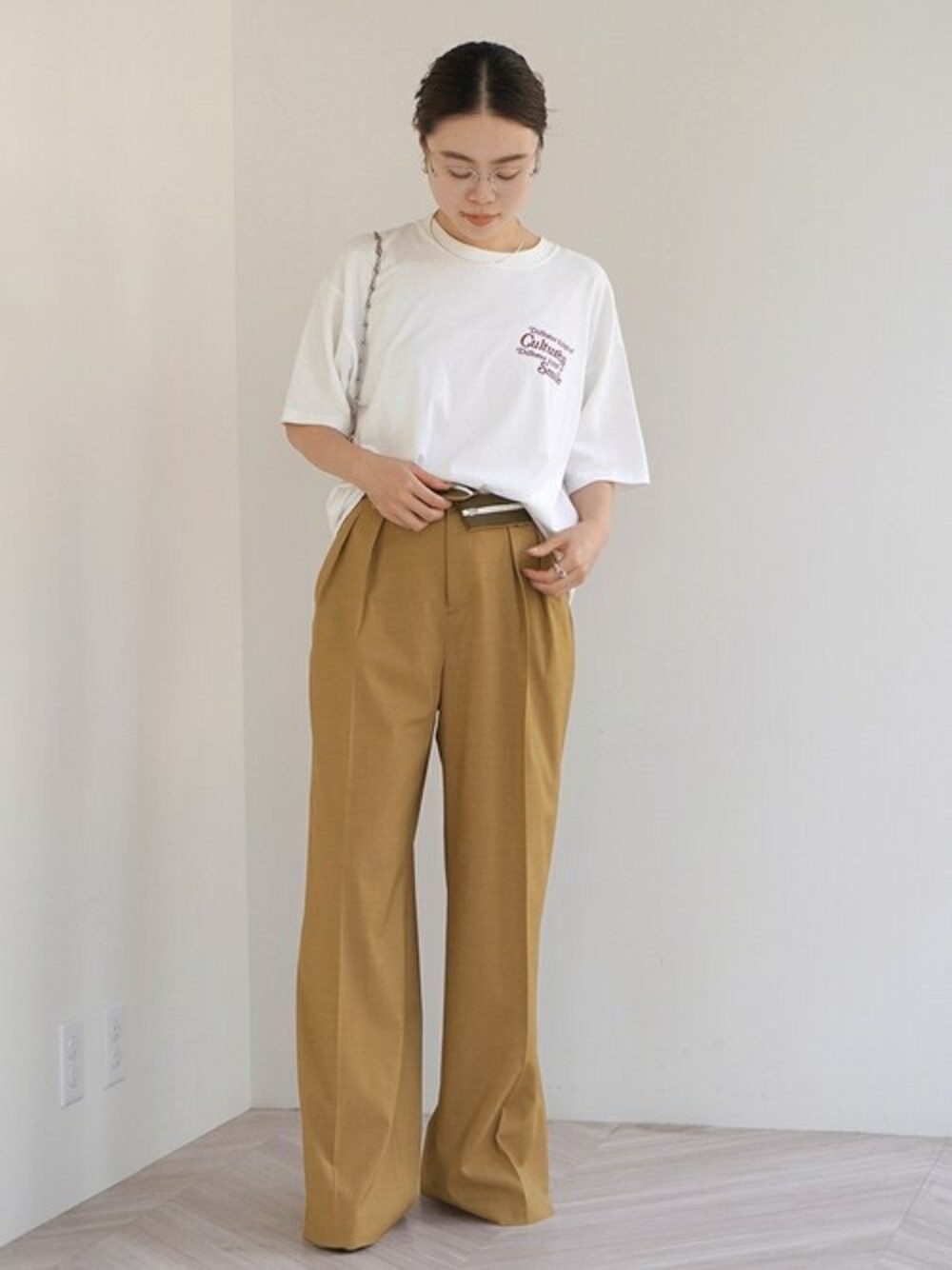 STAFF.O(AP STUDIO 新宿店)のスラックス「カラーベルトタックパンツ」を使ったコーディネート