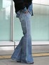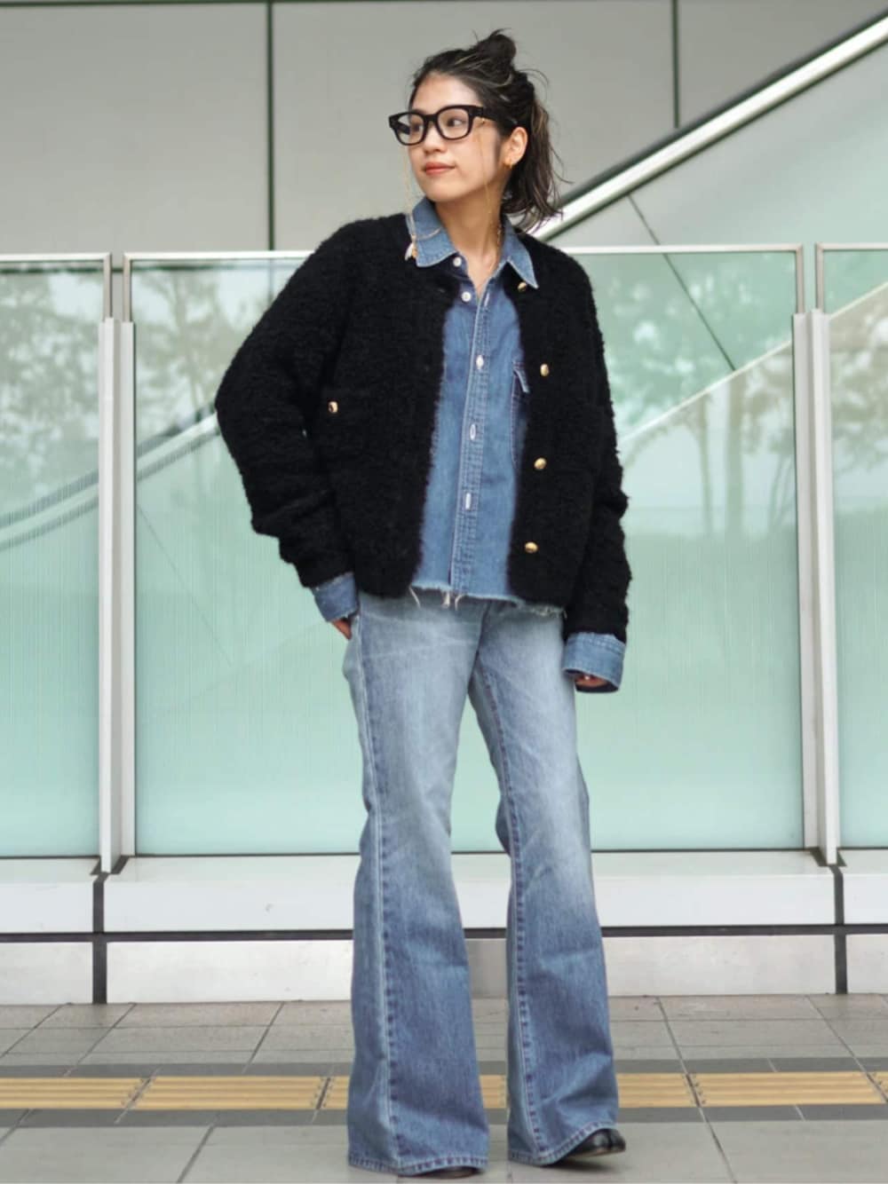 70年代ムードが漂いながら、モダンで今の気分で穿けるフレアデニム。 金ボタンがポイントになったニットジャケットと合わせることで、ほどよくカジュアルダウンしたコーディネートに。
