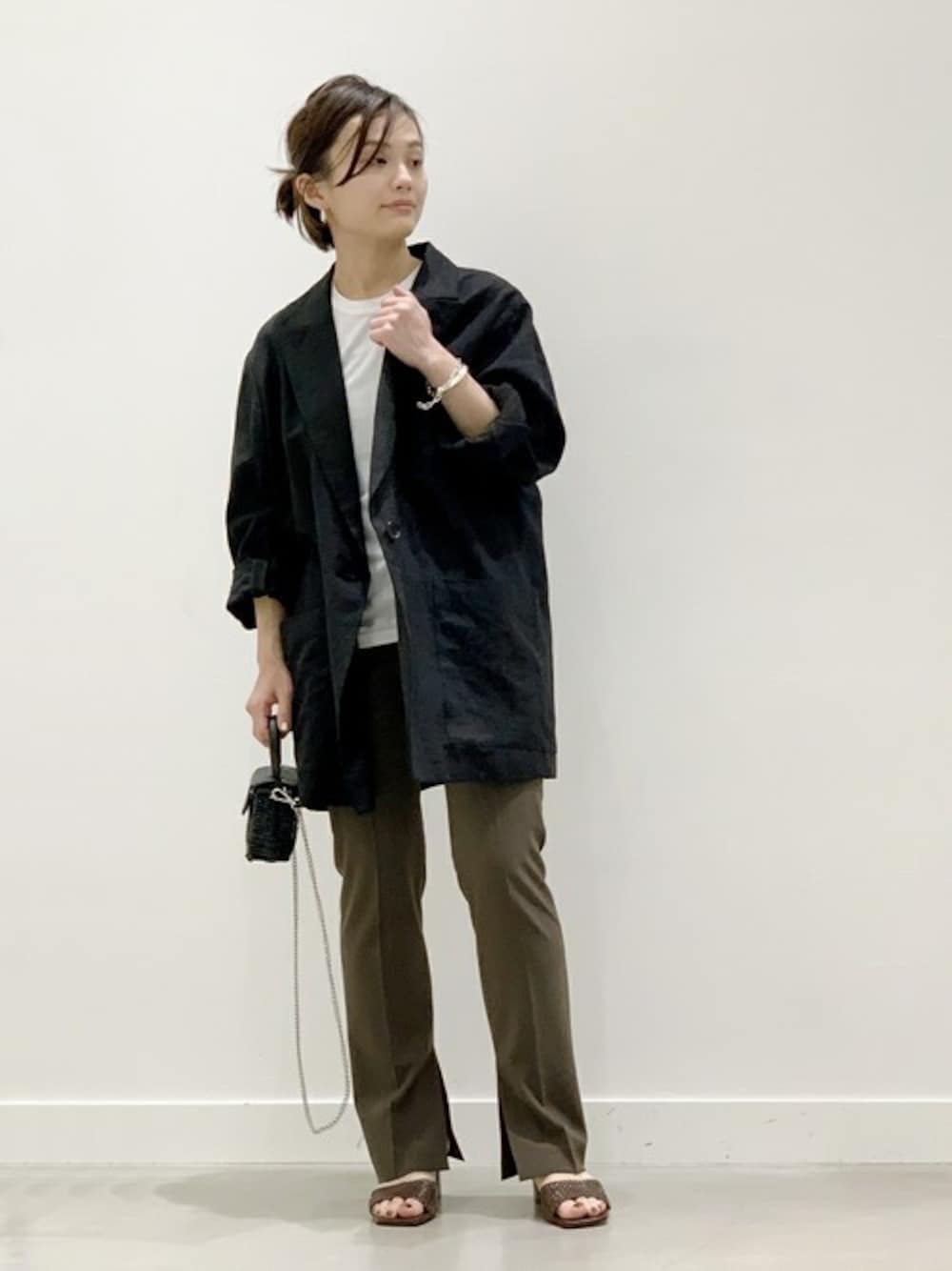 清涼感のあるリネンのコートは、 オーバーサイズにすることでリラクシングな印象に。 ブラックで光沢があり上品さも忘れていません◎ ボトムスは細身のパンツにすれば、よりスタイルアップします。