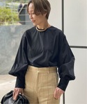 上品なコットン素材を使用したクルーネックブラウス。 首周りはきゅっとコンパクトでシンプルな作りながら、その分袖口にたっぷっりタックを取り、ギャザーを寄せることでゆったりとしながらもメリハリのある印象に。 ボリューム感のあるスリーブはどこから見ても素敵なシルエットです。 袖口にボタンを付けているので、袖を捲り上げること動きやすくなったりアクセサリーと合わせやすくなっているところもポイントです。 フェミニンさのあるボリュームスリーブが、今シーズン気分のブラウスコーディネートに仕上げてくれる。 レザーパンツ×ブラウスでメリハリのあるモダンなスタイルに。