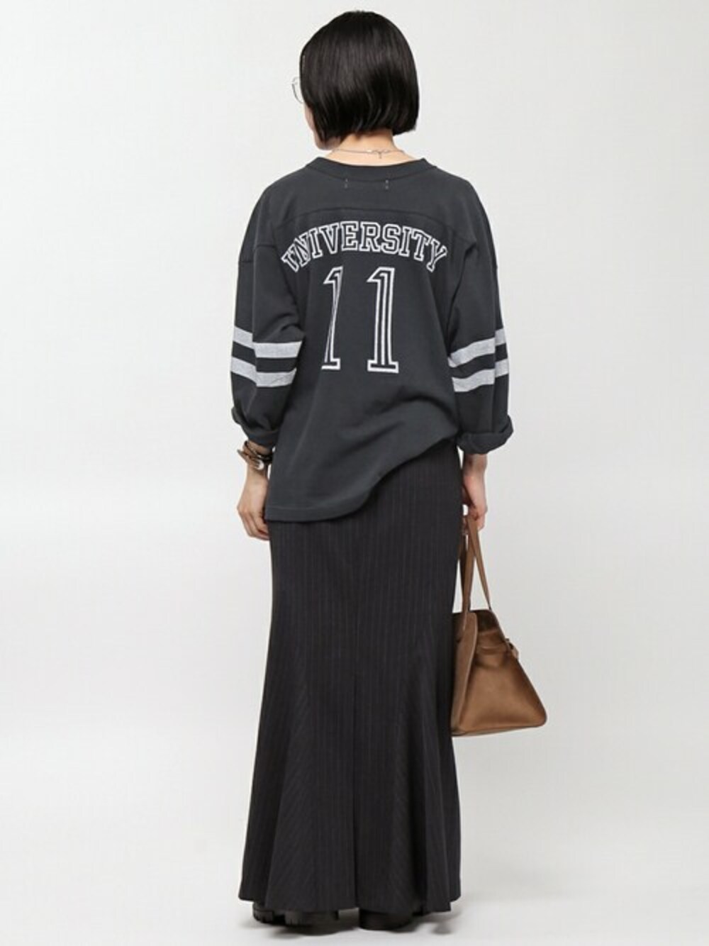 こなれ感を演出するR JUBILEE ベッチュウ Football Tシャツ。 後ろ姿も抜かりない雰囲気のあるバックプリントは、大人のカジュアルスタイルにすっと馴染む、頼れるアイテム。 メンズライクな素材と女性らしいシルエットのバランスが魅力のStripelong SKを合わせて。 ボトムに合わせるだけでぐっとモダンなバランスが叶います。 PUNTOVITAのバングルやバックのブラウンを差し色に。 GUCCIのメタルフレームで艶っぽさもプラス。