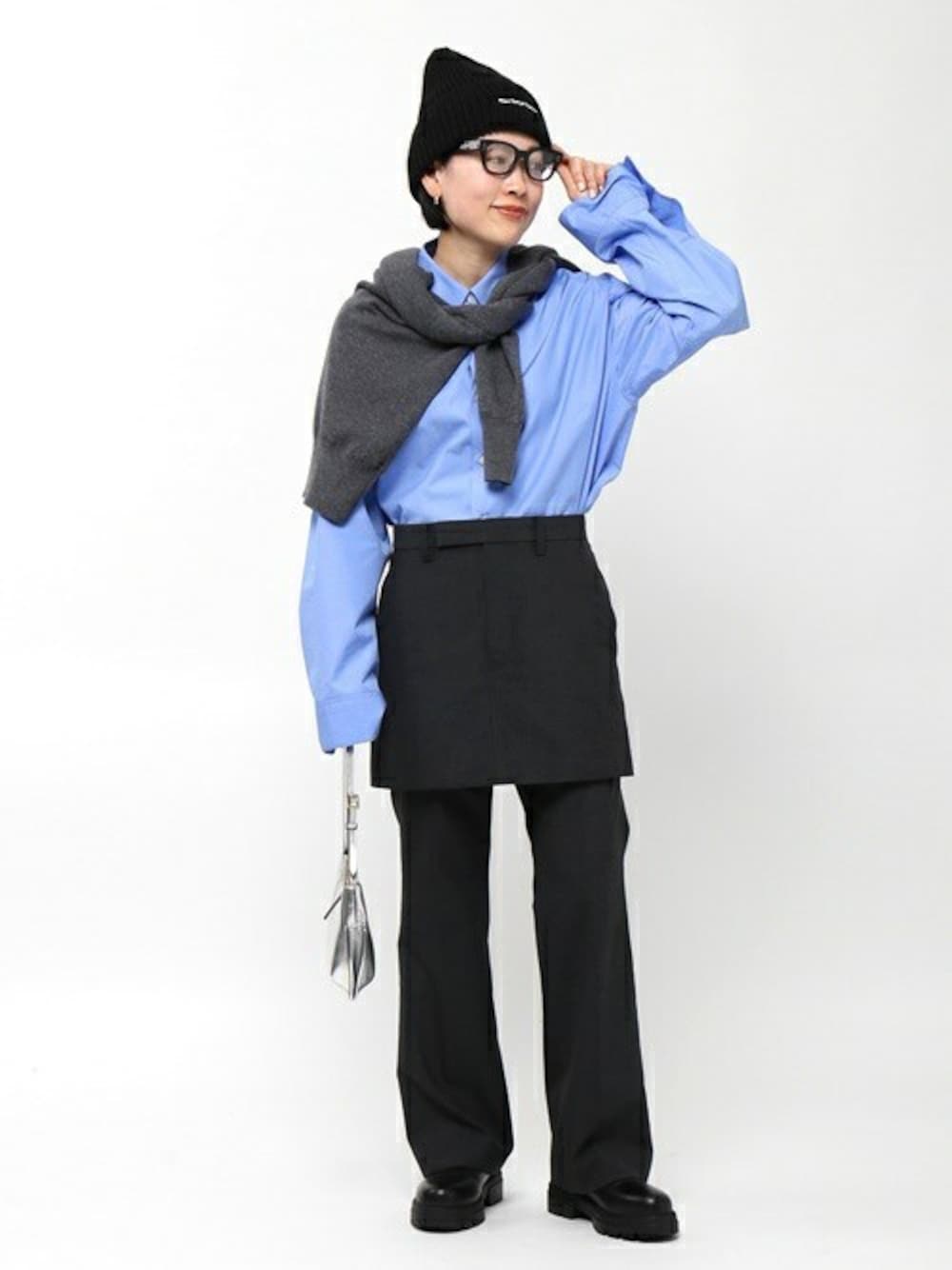 襟元を閉めて着ても開けて着てもバランス良く仕上がる、WIDE SLEEVE SHIRTS。 ややゆとりのある襟元が、首元をすっきりと綺麗に見せることで、秋冬の重厚感あるウェアにも相性◎ これ一つでスタイルがブラッシュアップするGRAY LAYERED PANTS。 ミニスカートをレイヤードしたパンツで、パンツ1枚での着用もできる嬉しいアイテム。