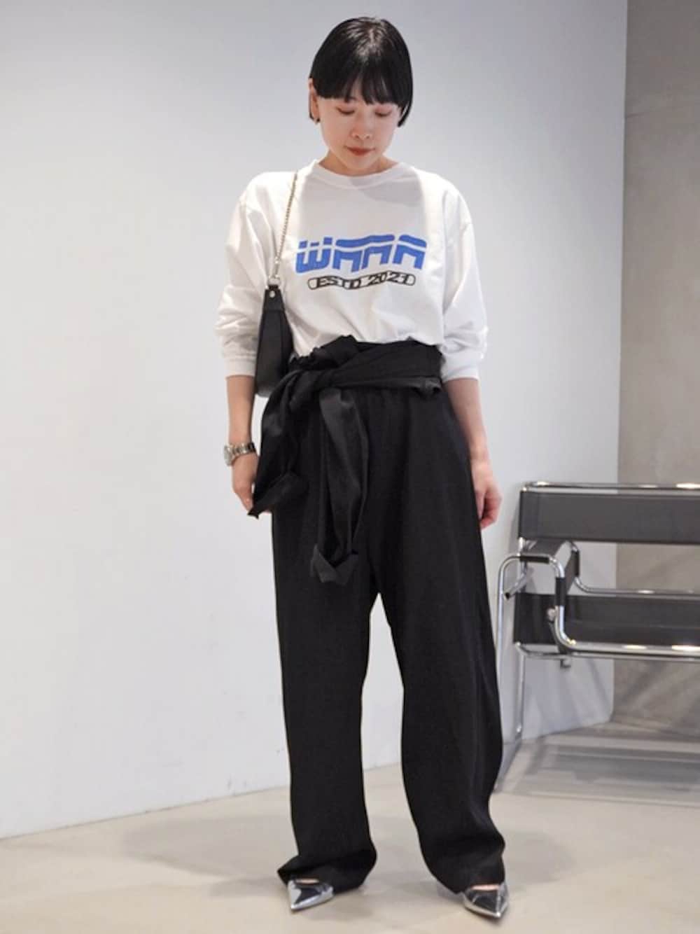 「STUDIO WEAREALLANIMALS」より別注したAP STUDIOだけの特別なグラフィックTシャツ。 90Sビンテージを彷彿とさせるグラフィックが新鮮な1枚。 モノトーンスタイリングにブルーロゴがアクセントに。 メンズライクなバランスながら、トップスをタックインしたハイウエストなバランスでメリハリを。 ポインテッドシューズやAULENTTIのチェーンハーフムーンバッグで艶っぽい女性らしさもプラスして。