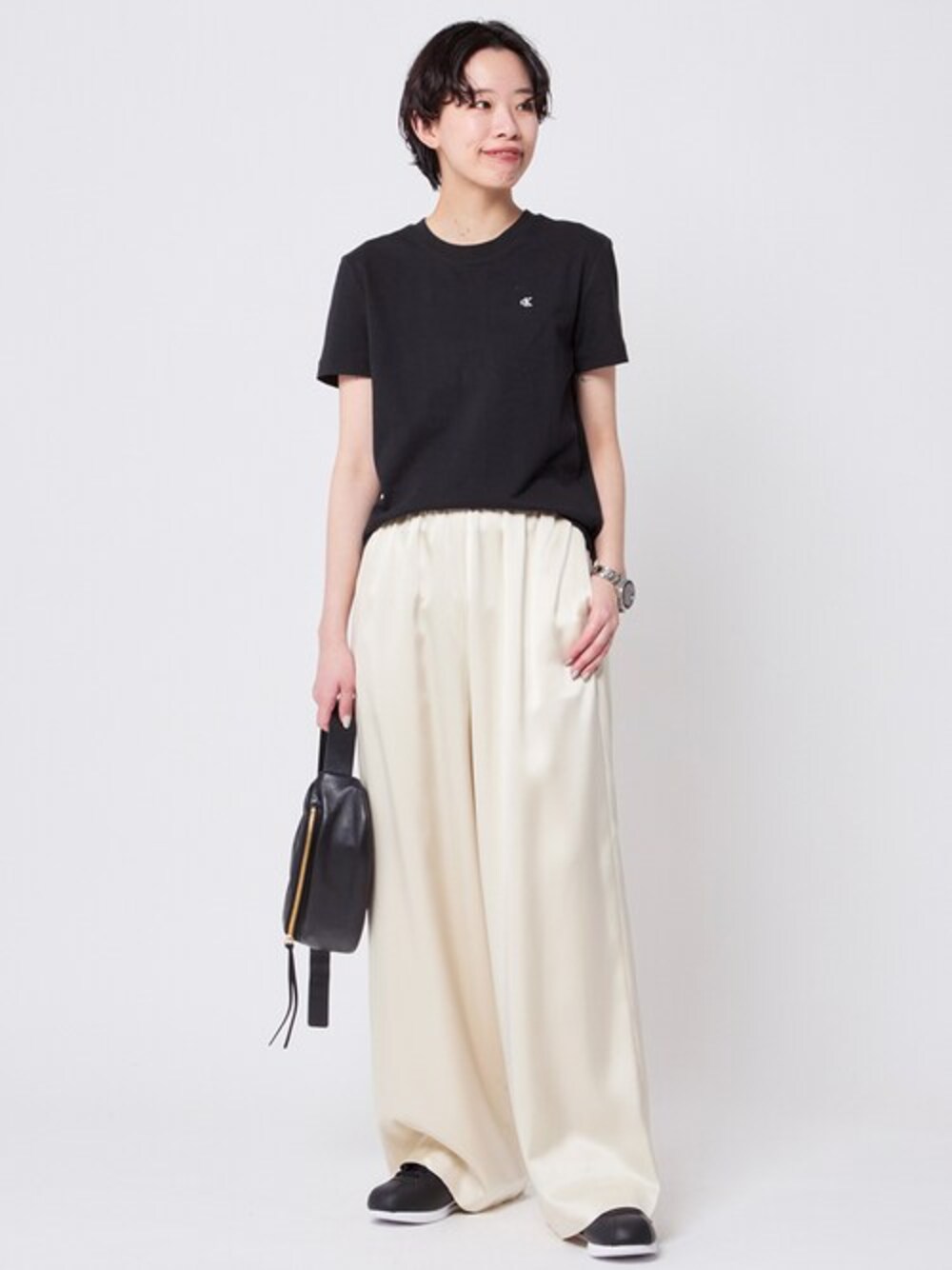 胸元のワンポイント刺繍がアクセントにのCALVIN KLEIN Compact CK embroidery T-sh。 コンパクトなシルエットながら、程よいハリがあり体のラインが出にくく着心地の良い一着。 光沢のあるしなかやなトリアセサテンイージーパンツで異素材MIXのスタイリング。 BLACKの小物で引き締め、春らしく軽やかに纏めて。
