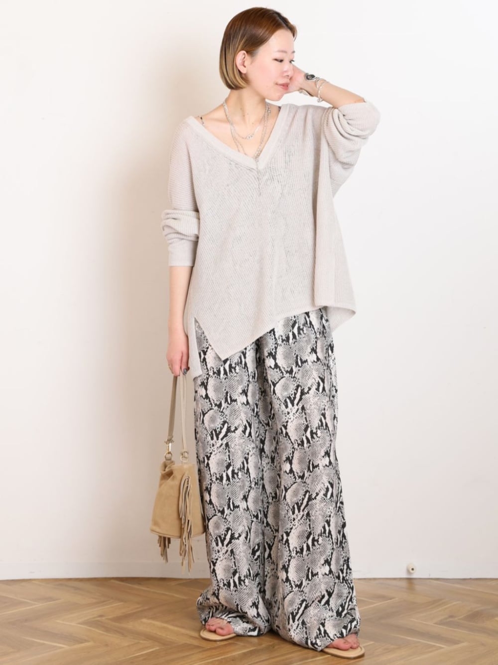 さらりとした清涼感あるリネンを使用した、ライトな着心地のVネックニット。 パイソン柄のワイドパンツは独特のヴィンテージ感のある生地で、綺麗めになり過ぎないリラクシーなスタイルにも◎