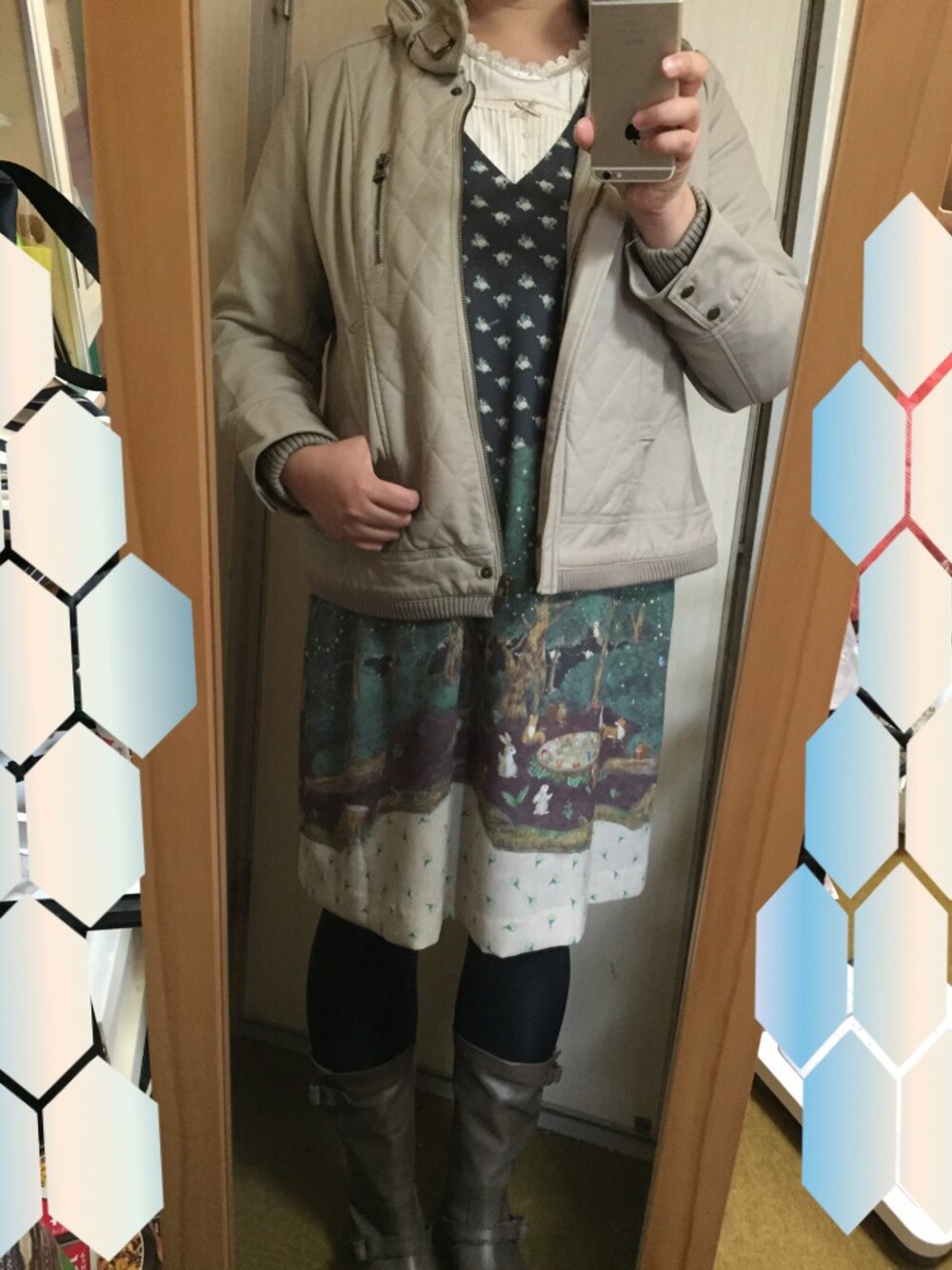フランシュリッペのピクニックジャンスカです。フェイクレザーのジャケットで辛口な感じを意識してみました。 ジャケットはサイドがリブになっていて動きやすいです。ちなみにおデブなので、すべて大きいサイズですf^_^;)