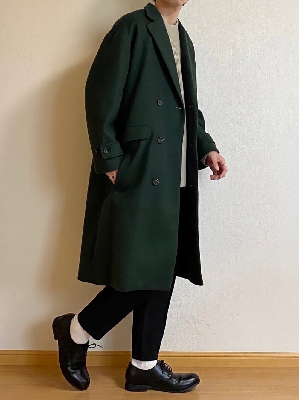 こんにちは! ご覧下さりありがとうございます☺️ いいね お気に入り フォロー フォルダインありがとうございます🙇♂️ コメントも頂けるとすごく嬉しいです☺️ ダブルチェスターコートコーデ。 もう12月なのでチェスターコートのお披露目🕺✨ このコートグリーンの発色がめっちゃ良くて去年から愛用してます🌲 グリーンの邪魔にならないように優しいベージュで合わせてあとはモノトーン😎 写真じゃ全く分かりませんが、ニットにチェックシャツをレイヤードしています✨ コートを脱いだらチラ見えするやつです🙈 良ければいいね お気に入り フォロー宜しくお願い致します🙇♂️✨