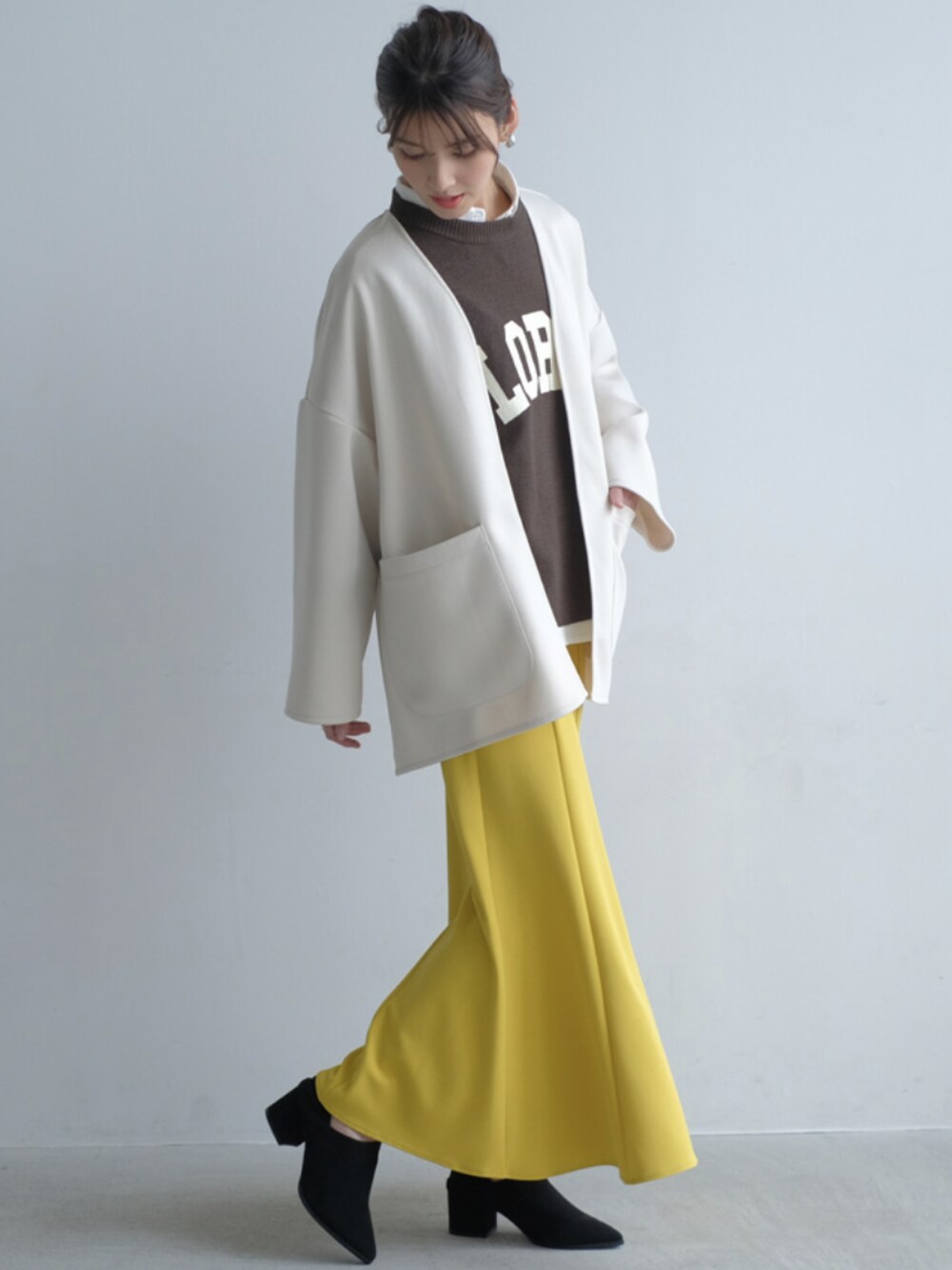 秋冬の重たさから一転、春はパッと明るい色が着たくなる季節です♪ 華やかな着映えカラーのイエローのマーメイドスカートを主役にした春先取りコーデ。 オーバーサイズのアウターを合わせ、ラフな着こなしにまとめると今っぽい着こなしに。 ロゴトップスを覗かせてカジュアルなアクセントに添えて鮮度よく。