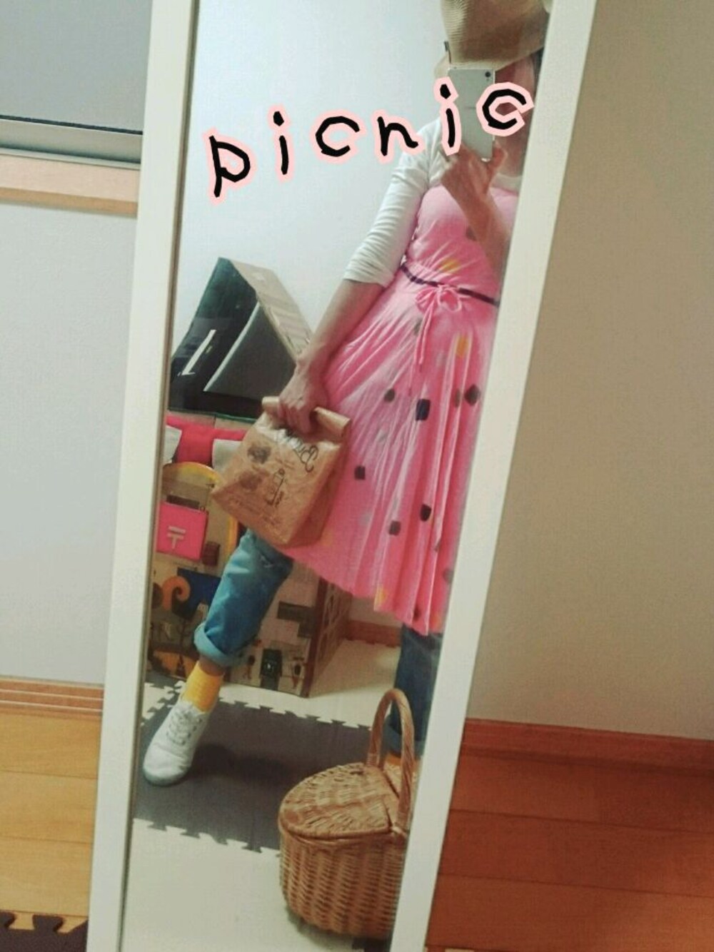万博へのpicnicコーデです(*^^*) 暖かい日のうちに、picnic(>_<) paperbagは中は保冷用になってて、こういう雑貨大好きなんでつい買っちゃいました♪サンドイッチ入れるのにちょうどいい(*≧∀≦*) ディーゼルのベアワンピ、サーモンピンクで少しレトロなヴィンテージ感が気に入ってます(*^^*) デニムをはいて、息子に負けないくらいがしがし動くぞー! ちらっと見えるダンボールハウスは、息子の為に手作りしました。