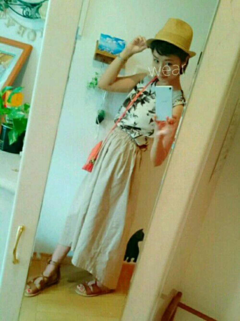 テールカットスカート×花柄ノースリーブ×オレンジ差し色ポシェット×夏小物 足首が見えるロングスカートなので、編み上げのサンダルもきちんと見える✨ けど、後ろのテールは手でスカートを持ち上げないと階段とかは擦ってしまう(^_^;) お姫様みたいにスカートを持ち上げて歩いてます💨笑