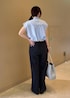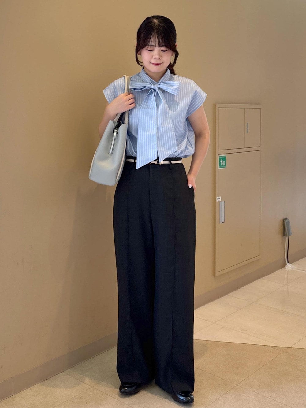 大きなリボンがアクセントなブラウスで、女性らしい甘めなオフィススタイル。ブラウス以外はモノトーンでまとめてきちんと感も。