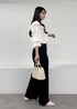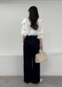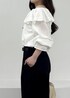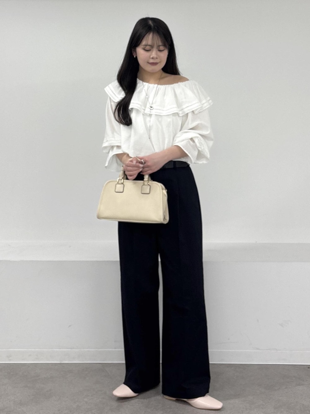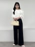 ボリューム感がかわいいフリルブラウスを主役にしたコーデ。綿ボイル素材なので甘くなりすぎず、ナチュラルに楽しめるアイテムです。ブラウス以外のアイテムはシンプルに、大人かわいいスタイルにしました。