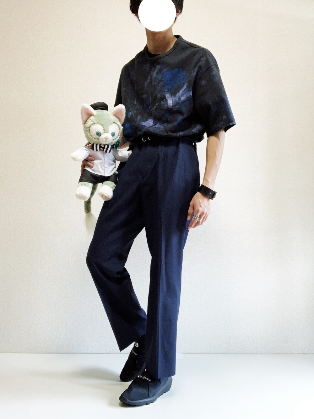 🧸おはようございます☀🧸 人形好きのまぁといいます!ぬいぐるみと一緒に写真を撮るのが好きになってお気に入りのぬいぐるみ達と一緒に撮らせてもらってます😊 もしよろしければいいね、セーブ、フォロー、コメントしていただけると元気出ます!!🤣 今日はシンプルコーデです✨ ネイビーのタイトめなパンツに、青い柄のカットソーを合わせてみました😊 タックインで足長効果期待してます!!🤣