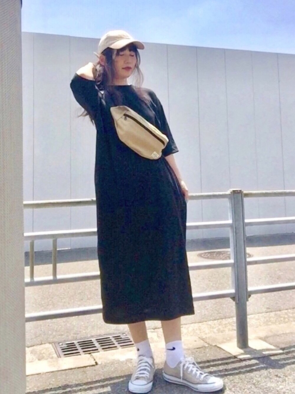 今日も暑くなりそう🤤☀️ 黒のTシャツワンピの着回しです😅 コンバースオールスター★ローカット👟 人気カラーで在庫切れ状態のベージュ✨ タイミングよくゲット出来ました✌︎ ウエポもキャンバス生地のベージュで😙 (いつものやつw)