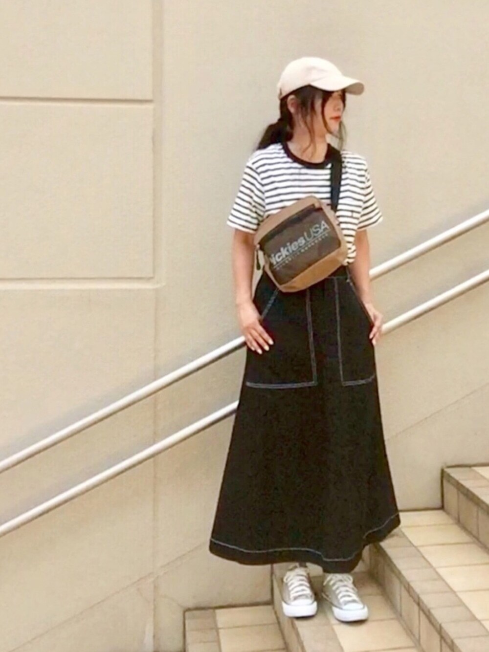 外歩いた後で暑さにやられてます😥 ボーダーT×ベイカースカートの シンプルカジュアル❤︎ スカートは白いステッチと 大きなポケットが気に入って zozoのお気に入り登録してたら タイムセールになったので 買おうかなと迷ってたところ あなただけのタイムセールで さらにお安くなったのでポチッと♪ 丈も長くてめちゃ気に入りました♡ ボーダーポケTはmen'sになります♪ バッグとスニーカーはベージュで☆ 暑い日に飲むクリームソーダは最高🤩