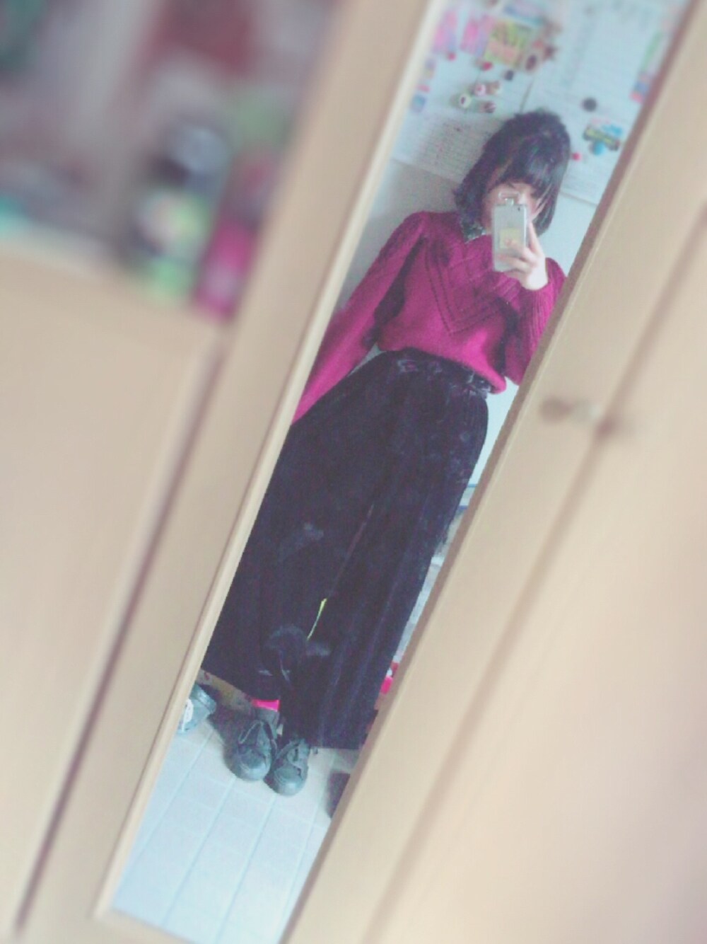 今日は何年か前に親戚のおばあちゃんが編んでくれた手編みのセーターきてる☺ すごく私好みだからもらっちゃった😚 シャツ襟だけ出るようにしてる🐶🐾 GUのベロアパンツ安くて買っちゃった🍴