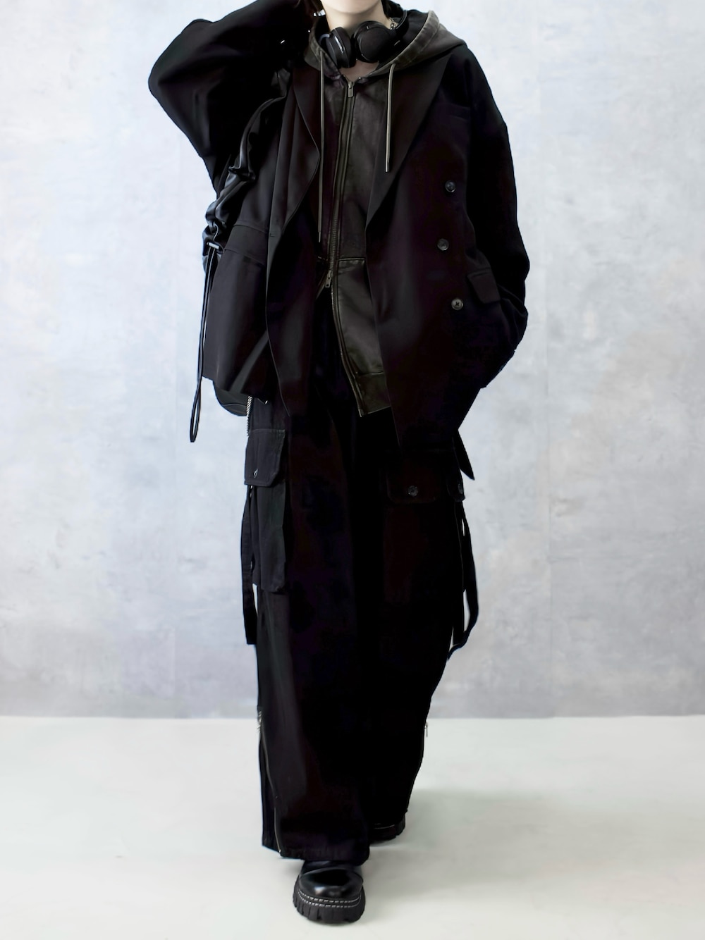 Aranのテーラードジャケット「【VELNUS】2way mode design over double tailored jacket / 2wayモードデザイン オーバーダブルテーラードジャケット」を使ったコーディネート