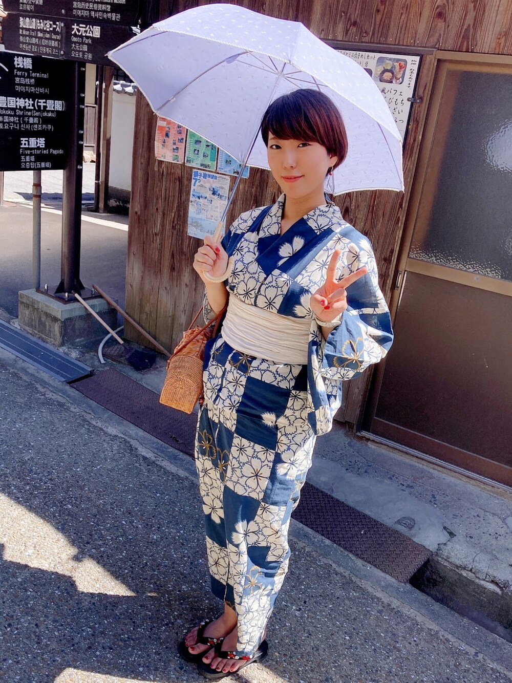 シンプルな桜柄の浴衣。 青とアイボリーとアクセントに金で大人の浴衣コーデ。お気に入りの浴衣✨