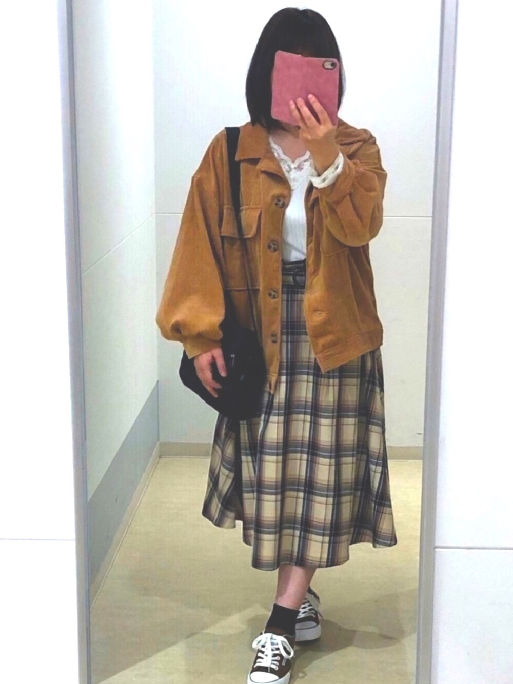 皆さんいつも いいね♡お気に入り、コメント📝フォローありがとうございます🙇🏻♀️💕 ららぽーとで使える1000円交換券が来たので昨日ららぽーとに行って沢山洋服買って来ちゃった🤣🛍✨ 夕飯はららぽーとのフードコートでやまや食堂の栄養バランスの良い食事をしました🤗🥗✨これで24品目なので健康的〜😆✨ お出掛けした時のコーデです🤗💖 久しぶりに外で撮影してみました😆✨ KANGOLのロゴと🦘マーク手で隠れてる〜😂 今回もjunさんの春夏秋冬のカフェオレコーデに参加します😆💖 キャメルのコーデュロイのジャケットにチェックのフレアスカートを合わせたカフェオレコーデです🤗✨ ジャケットとスニーカー👟をコーデュロイで色味も合わせてます🤗✨スニーカーはブラウンです✨ アプレジュールのデコルテとお袖がレースで可愛いカットソーとスニーカーの先端の色味をホワイトで合わせました😆💖 バッグは🦘のロゴとマークが可愛いKANGOLのショルダーバッグをブラックで引き締めました🤗✨ 暗すぎてスニーカー👟がブラックに見える〜🤣🤣ホントはブラウンです😅 又皆さんの所にお邪魔しますのでよろしくお願いします🙇🏻♀️💕 もしよろしければ、いいね♡お気に入り、コメント📝フォローして頂けると嬉しいです💖
