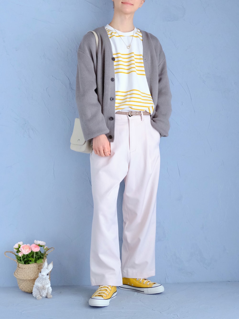 こんにちは🌞 みていただきありがとうございます♪ よかったらいいね👍お気に入り+フォローしていただけるとしっぽ振って喜びます🐕 今回はイエローコーデです✨ くすみ色のカーディガンを上から羽織って少し活発な春らしさの中に少し上品なテイストをプラスしたよ✌️