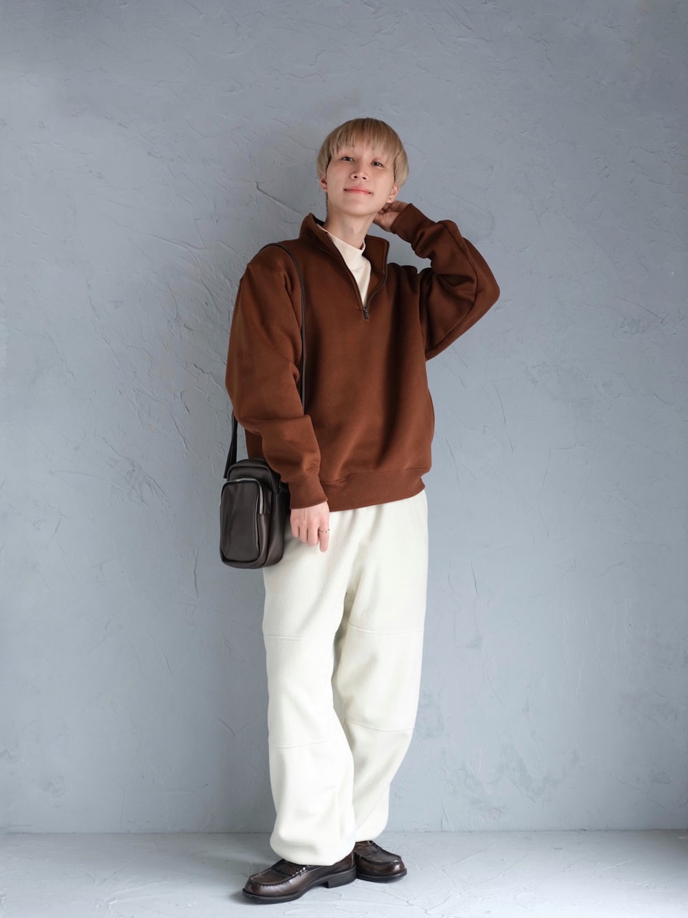 こんにちは😃 みていただきありがとうございます♪ 今回はラフなブラウンコーデです‼️ 全体をブラウンとホワイトにして、落ち着いた雰囲気をまとっています☺️ はー日ジップスウェットの中にハイネックのスウェットを着てレイヤードを楽しんでいます👌 秋にぴったりなコーデですね🍂