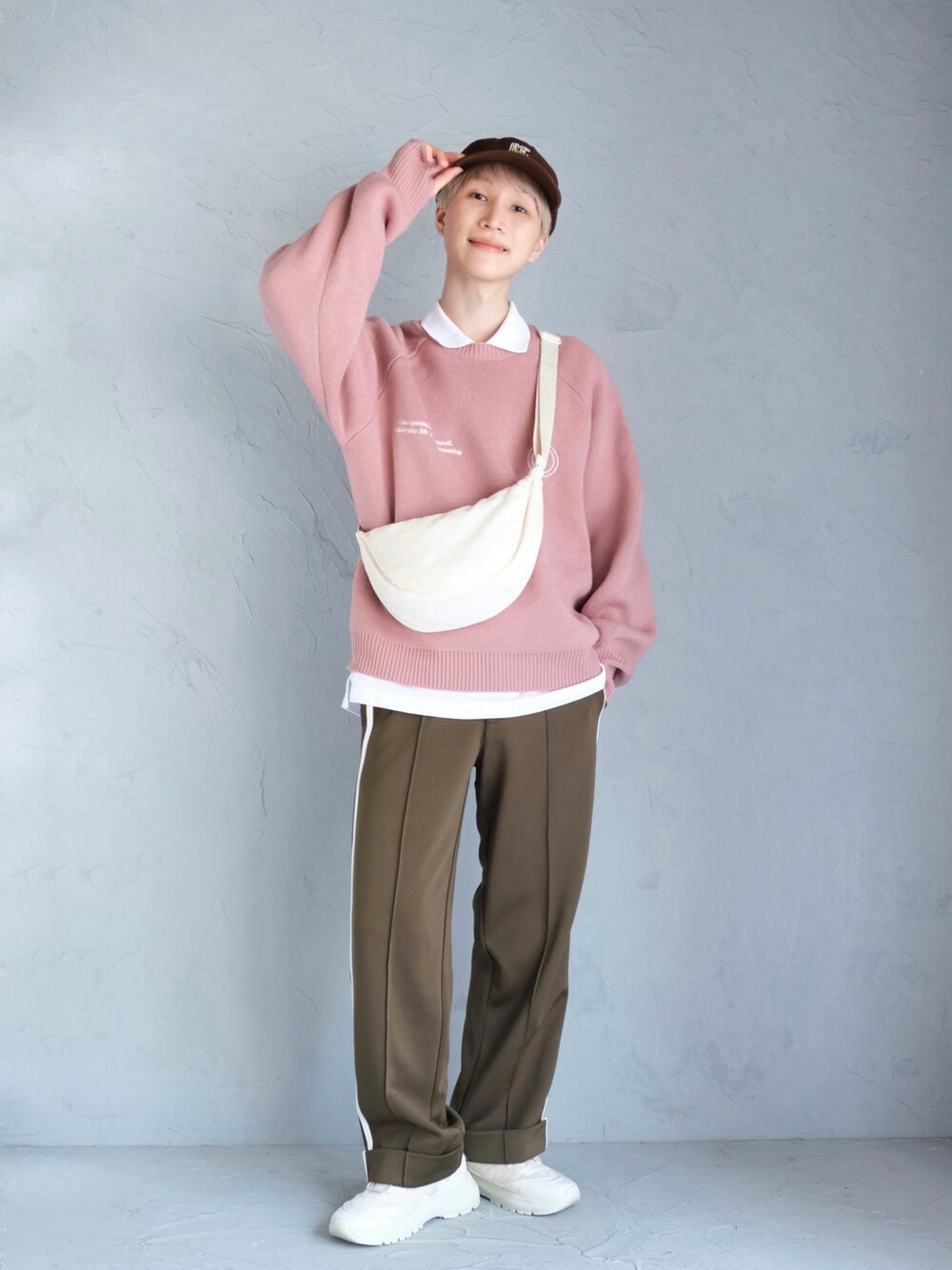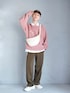 ピンクニットを着たスポーツMIXコーデ⚽️ サイドラインパンツやポロシャツを合わせるとアクティブスタイルに寄せることができますよ〜☀️