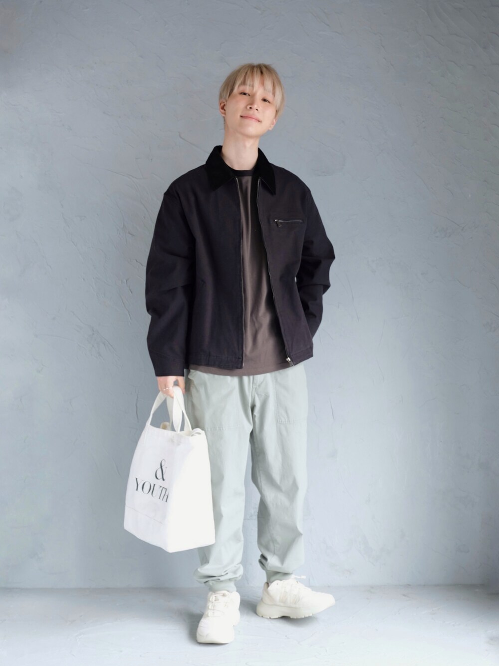 今回はボトムスに春色をとりいれたコーデです☘️ 下側が明るいと、ボトムスが軽そうに見えることからアクティブで若いってイメージになりやすいですよ😄 その上、ジョガーパンツを選んでるのでより活発なイメージになりますね‼️