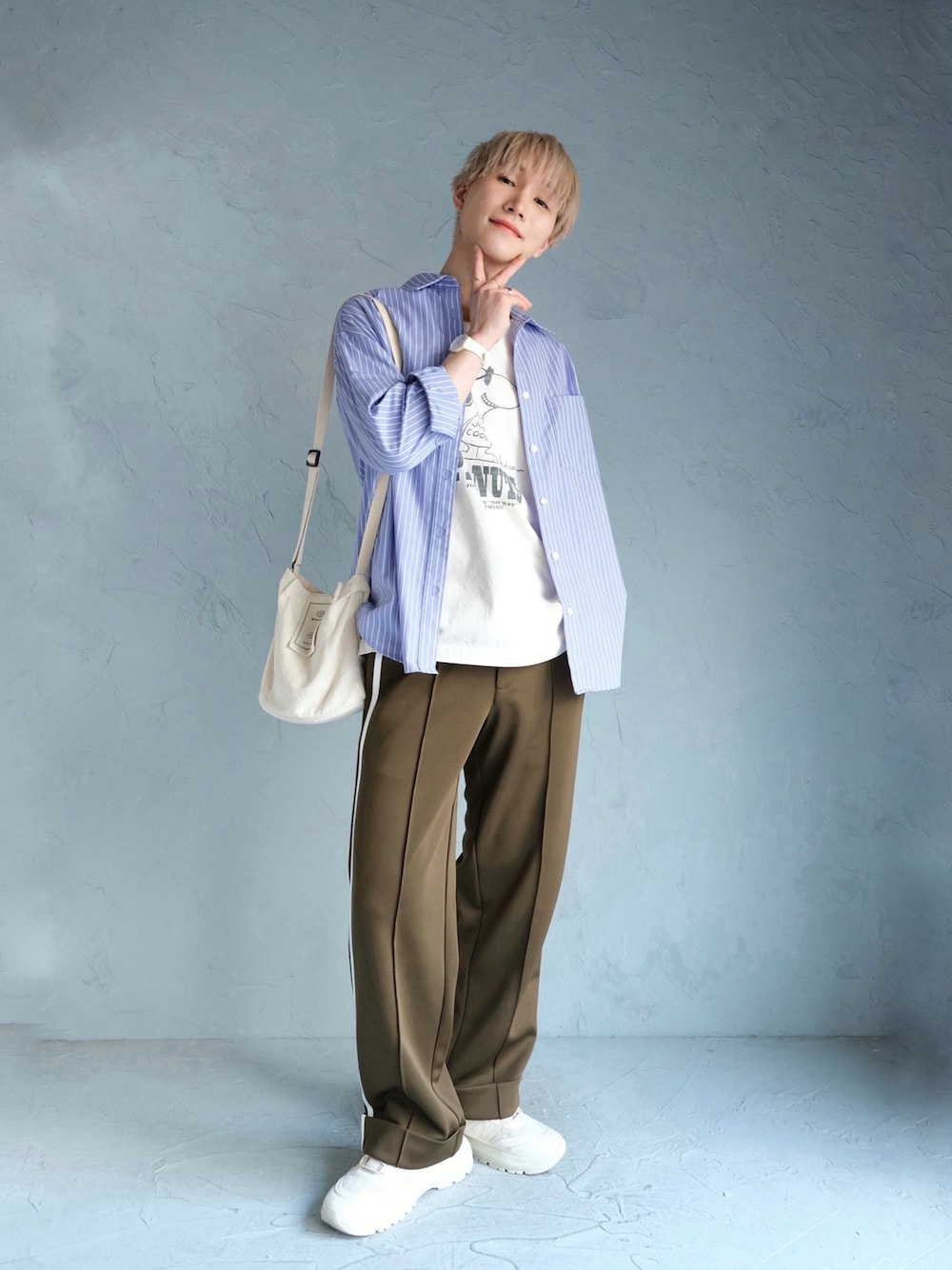 ストライプシャツを着た春のレイヤードコーデ☘️ スポーティなテイストのアイテムをプラスすると今っぽくなっていいですよ〜😆 オレンジリップをつけて気分も春っぽく☀️