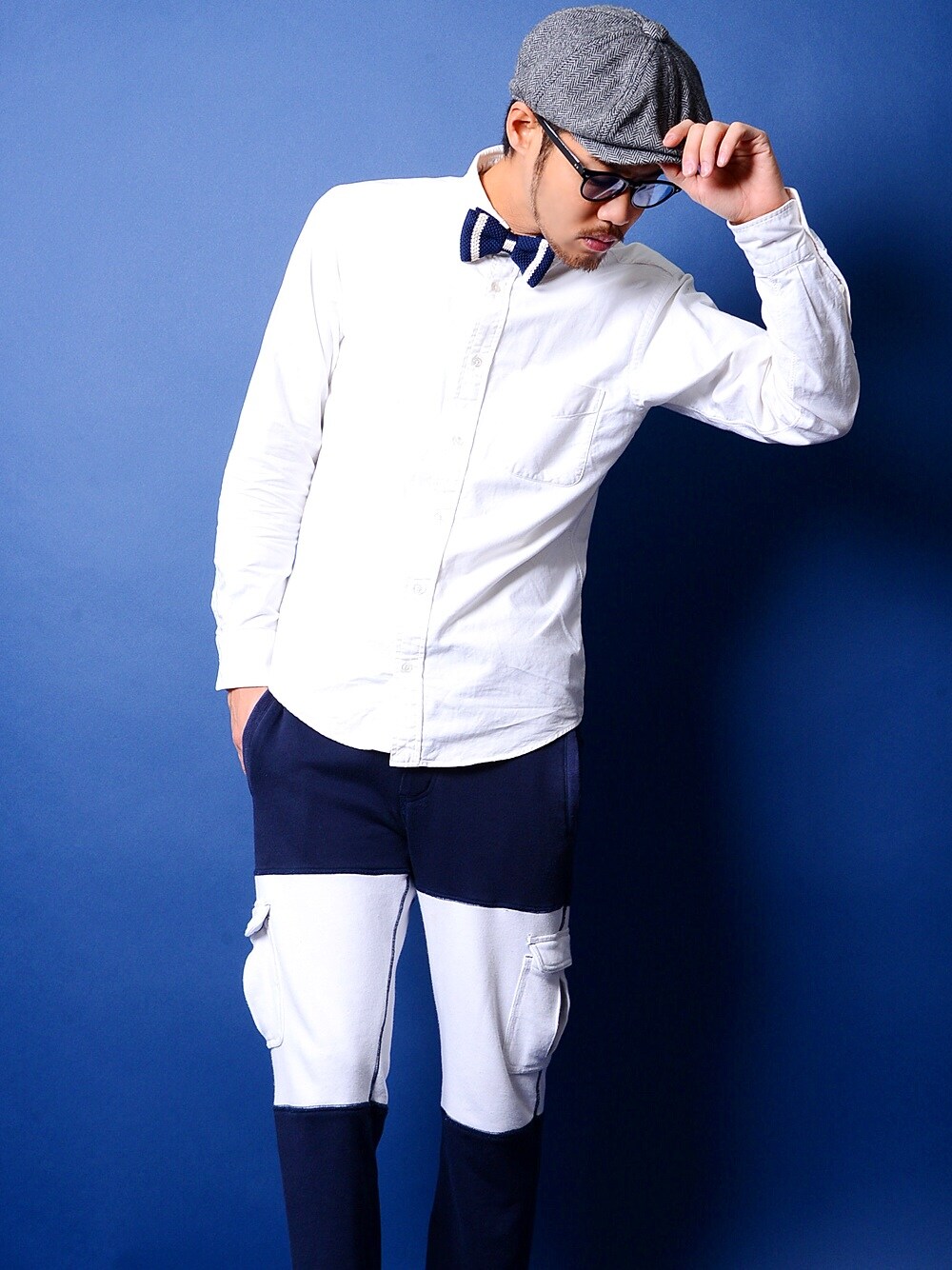 ブルー系の蝶ネクタイを着用したメンズの春コーディネートの1枚目の写真