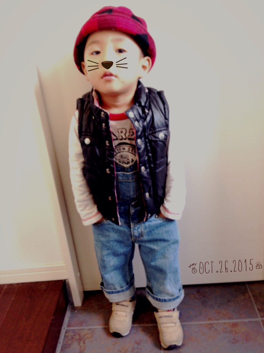 次男君が時間帯、性格的にも一番撮りやすい‼️ お下がりで貰う約束してたサロペット❤️ 古着屋さんで安くGET出来たリバーシブルの中綿ベストを合わせて😆 今度親子でリンクコーデしよ😙💕