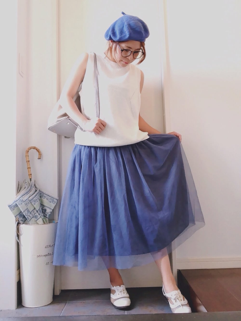 おはようございます😊✨ いつも見て下さりありがとうございます🙏🏻✨ いいね♡&セーブ&フォロー、コメントもとても嬉しいです😍 また、昨日はドラフトエントリーの応援コメントもたくさん頂きまして、本当に勇気付けられました😊💕 この場をお借りして改めてお礼させて頂きます😌🙏🏻✨ありがとうございます❤️ さてさて ドラフトエントリー2回目コーデは、 SEVENDAYS=SUNDAYのニットベスト✨実はこのアイテム、Tシャツとセット900円という主婦には大変嬉しいお値段でした😍💕 少しゆったり着たくてLサイズに挑戦‼️ 爽やかに白とブルーにまとめたいなぁと思い、久々ブルーのチュールスカート引っ張り出してきました😊✨ 本当はミモレ丈だと思いますが、チビーズが履くと大抵マキシ丈に見えます😂 頭にもブルーのニットベレー帽😆✨ 足元は、分かりにくいけどスケルトンのトラッドシューズです❤️ ちょいと若かったかな…