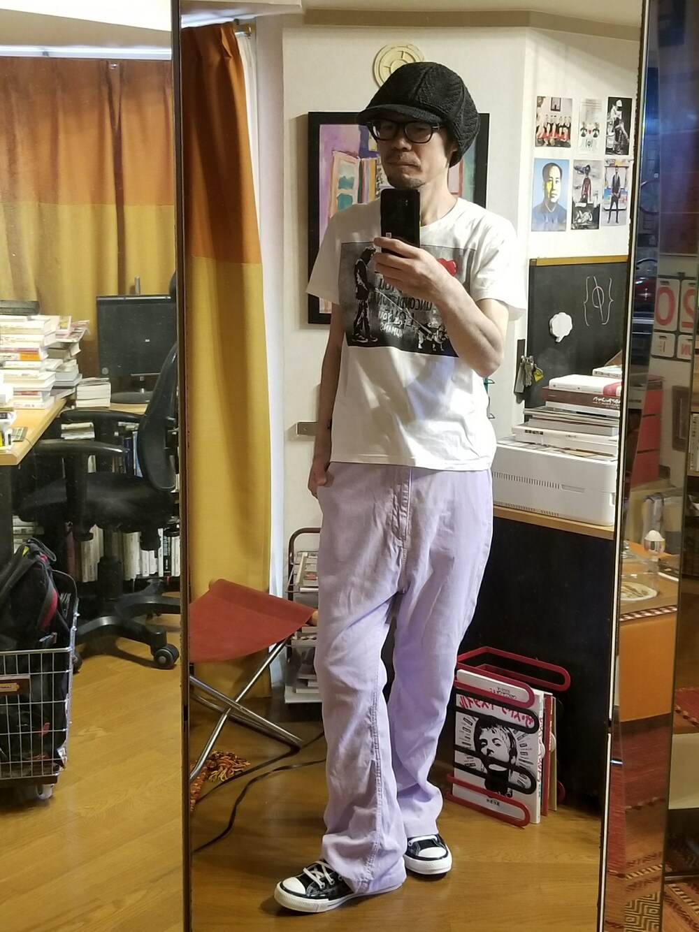 サマーコーデュロイのパンツです。 サルエルで裾がフレアになった形のパンツにいっとき激ハマりしておりました。リラックス感と膝に向かって絞りストンと落ちる縦長シルエットを両立してるところが好きです。かなり初期ものだけど私服は土日しか着ないので結果的に物持ちはよくなりますね。 Tシャツはバンクシー風プリントが施されております。あくまで「風」です。プリント内の人物もオールスターを履いてるっぽいのでだとしたらコラボってことになりますが、後から気付いた偶然です。笑 バンクシーの作品ではテディベアが機動隊に向かって手榴弾投げつけてるヤツが一番好きかな。 なんか、お腹が痛いようないたくないような… 痛くない方に賭けてみるか!