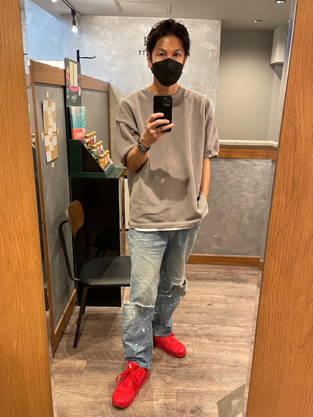 グレーxライトブルーで 薄い色合いだったから スニーカーはレッドでアクセント デニムのペイントとダメージは 白ペンキとノコギリで自作です笑