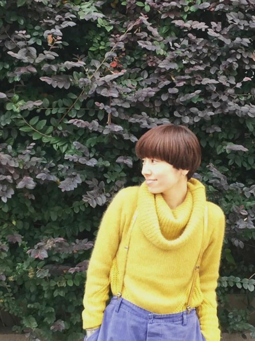 ビタミンカラーのオフタートルニットの着こなし。