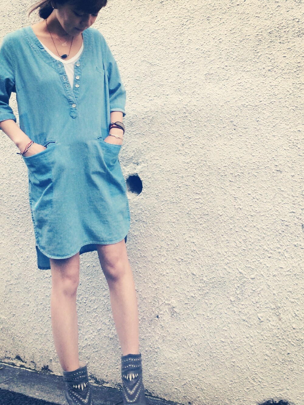 色ムラがおもしろいデニムワンピース。 一枚で!アクセ、靴の組み合わせで自由自在。