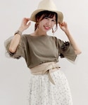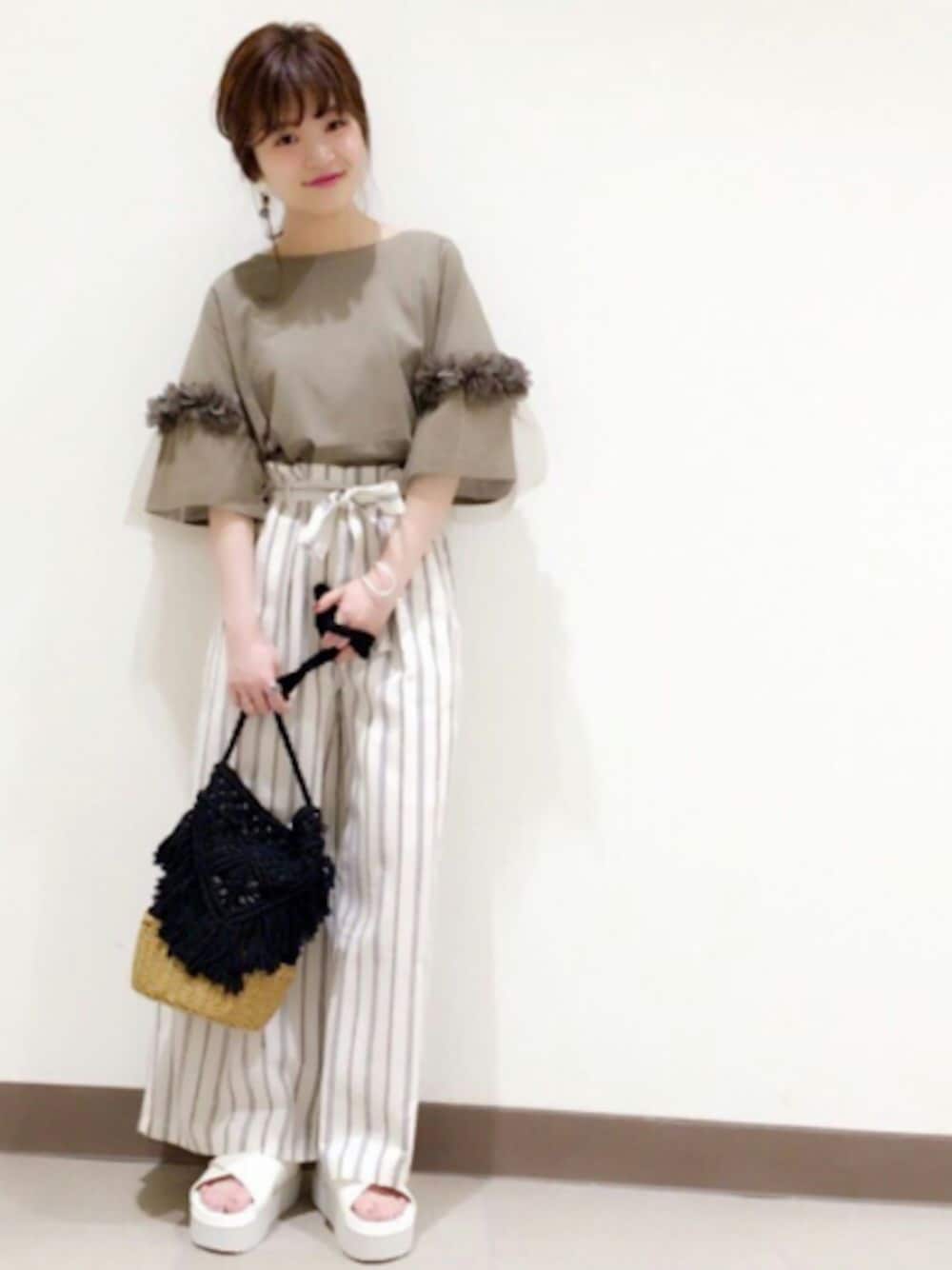 フラワーチュールがポイントのTシャツは カジュアルすぎない印象に ストライプのワイドパンツで爽やかな夏コーデ 🍥model:まるこ🍥 個性派カジュアルなまるこのwearもゼヒcheckしてみてください♩