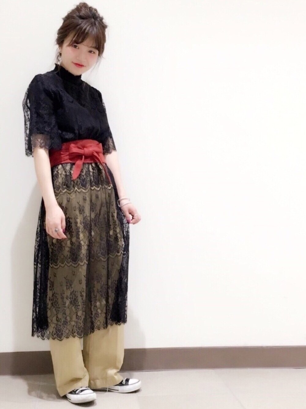 透け感のあるレースワンピースを ベージュのチノパンで合わせた カジュアルコーデ!! 赤のサッシュベルトで アクセントをプラス✨ 🍥model:まるこ🍥 個性派カジュアルなまるこのwearもゼヒcheckしてみてください♩