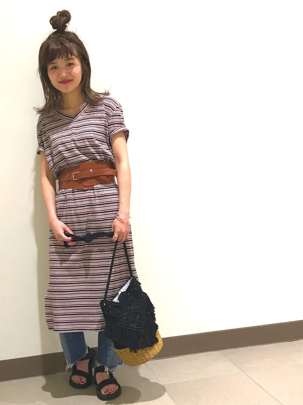 ボーダーのTシャツワンピでリラックススタイル✨ ウエストマークでスタイルアップ! サンダルとかごバッグでカジュアルも夏にバージョンアップ💕 🍥model:まるこ🍥 個性派カジュアルなまるこのwearもゼヒcheckしてみてください♩