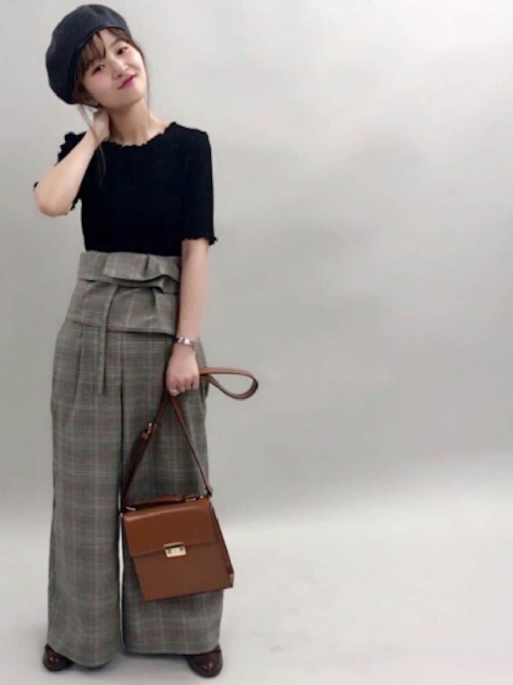 コルセットベルト付きのワイドパンツは チェック柄で秋を先取り ベレー帽とレースアップシューズでレトロ感をプラスして 🍥model:まるこ🍥 個性派カジュアルなまるこのwearもゼヒcheckしてみてください♩