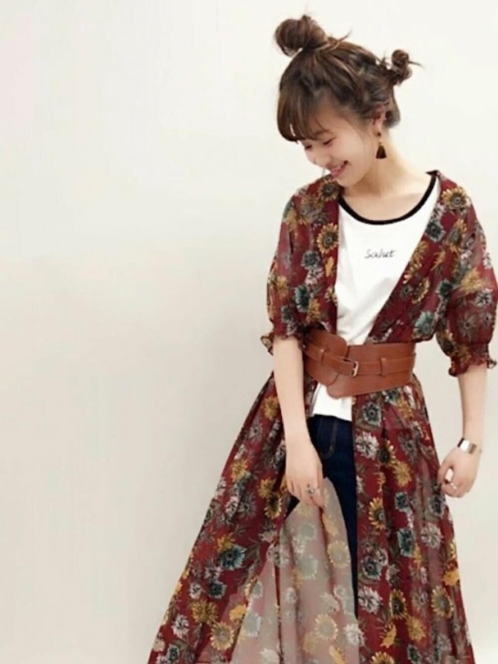 ロゴTにさらりと花柄ガウンを羽織った カジュアルstyle✨ ウエストマークをすると 今年らしく着こなせる♪ 🍥model:まるこ🍥 個性派カジュアルなまるこのwearもゼヒcheckしてみてください♩