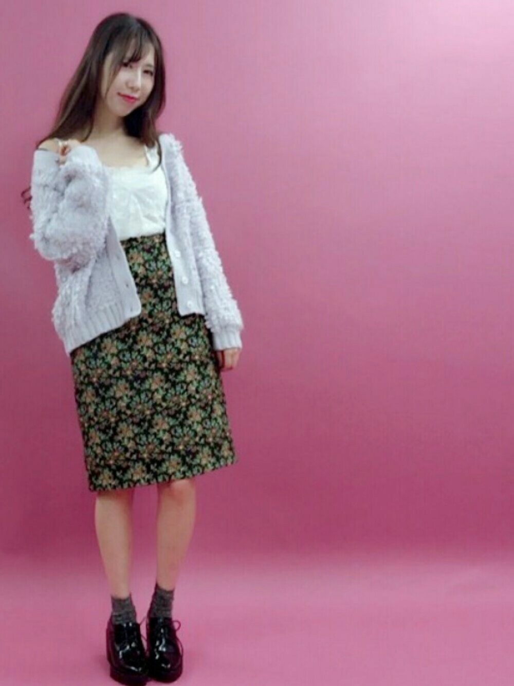ふわゆるのショートカーデと ゴブランスカートの女子鉄板コーデ✨ 足元はマニッシュなレースアップ シューズで甘くなりずにするのが◎ 🐰model:ayaka🐰 トレンドフェミニンなayakaのwearもゼヒcheckしてみてください♩