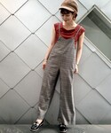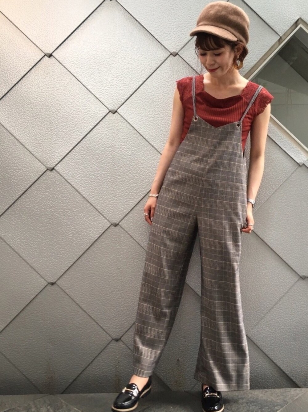 オールインワンで楽チンコーデ✨ 秋カラーでほっこり🍁 ローファーとキャスケットで少年っぽく着こなして。 🍒model:あかねこ🍒 フェミニンコーデなあかねこのSNSもゼヒcheckしてみてください❤︎