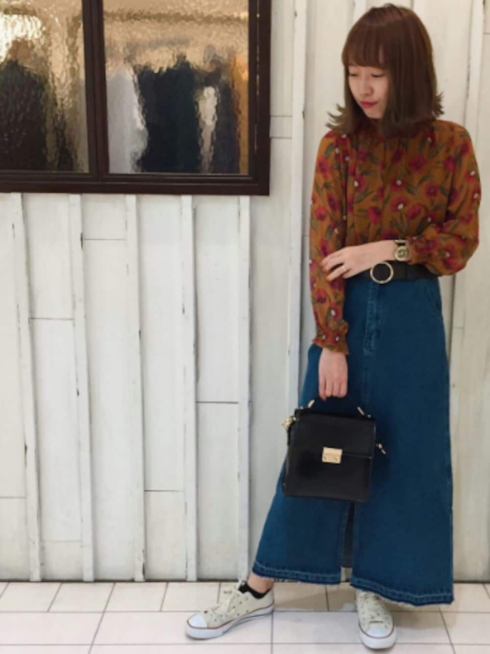 レトロな花柄ブラウスは デニムのマキシスカートとスニーカーで 大人カジュアルに